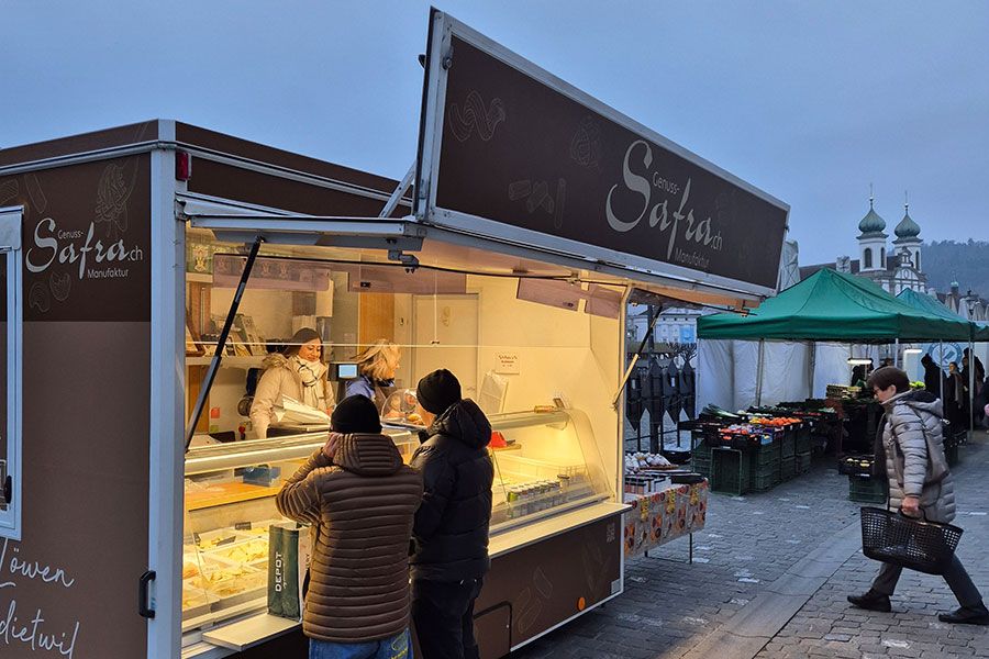 Unser Määrtstand in Luzern an der Reuss auf der Altstadtseite