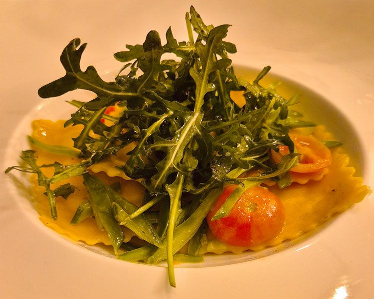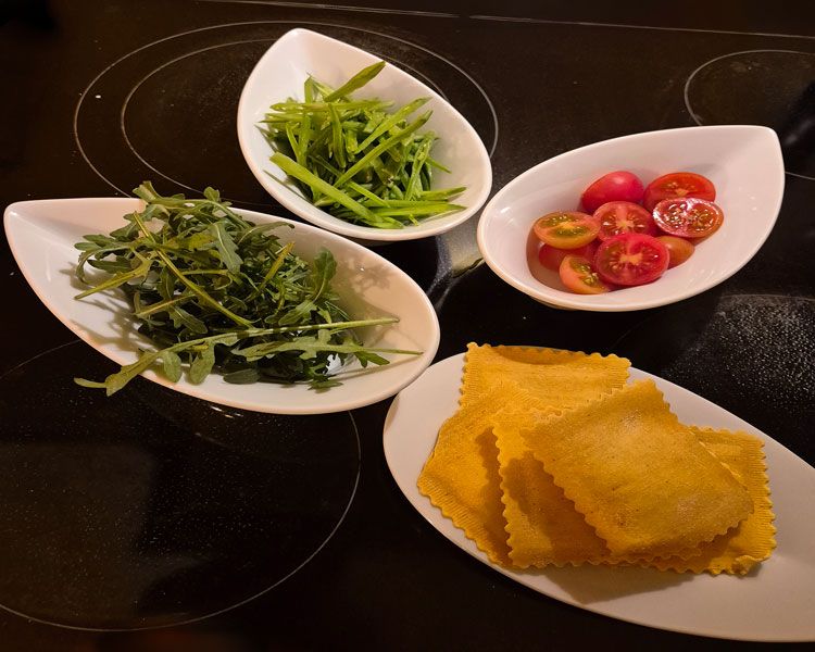 Scampi-Red Thai Curry Ravioli im gesalzenen Wasser 6 Min sieden. Kefen in Streifen geschnitten und kurz in Butter anziehen. Cherry-Tomaten halbiert, dazugeben und schwenken. Mit Salz und Pfeffer würzen und auf einem tiefen Teller anrichten. Rucola mit Olivenöl, Salz und Pfeffer marinieren und am Schluss als Garnitur auf die Pasta geben. Servieren
