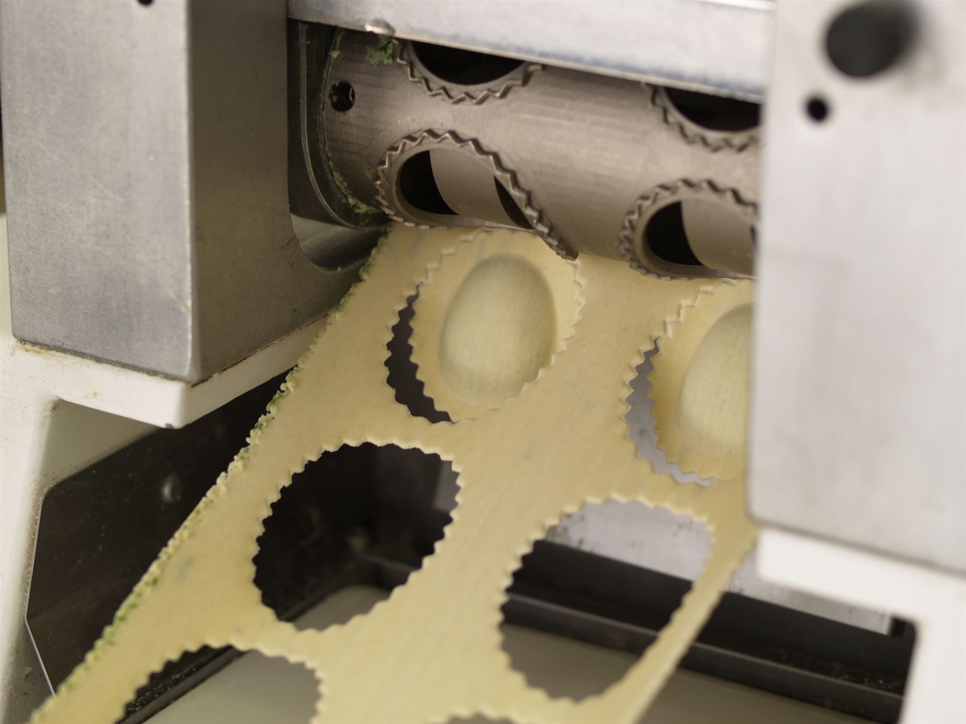 Langsam zieht die Maschine die beiden Teigrollen hinein. Die Spinatfüllung wird links und rechts vom Teig eingeschlossen. Anschliessend presst die Maschine die Teige aneinander.