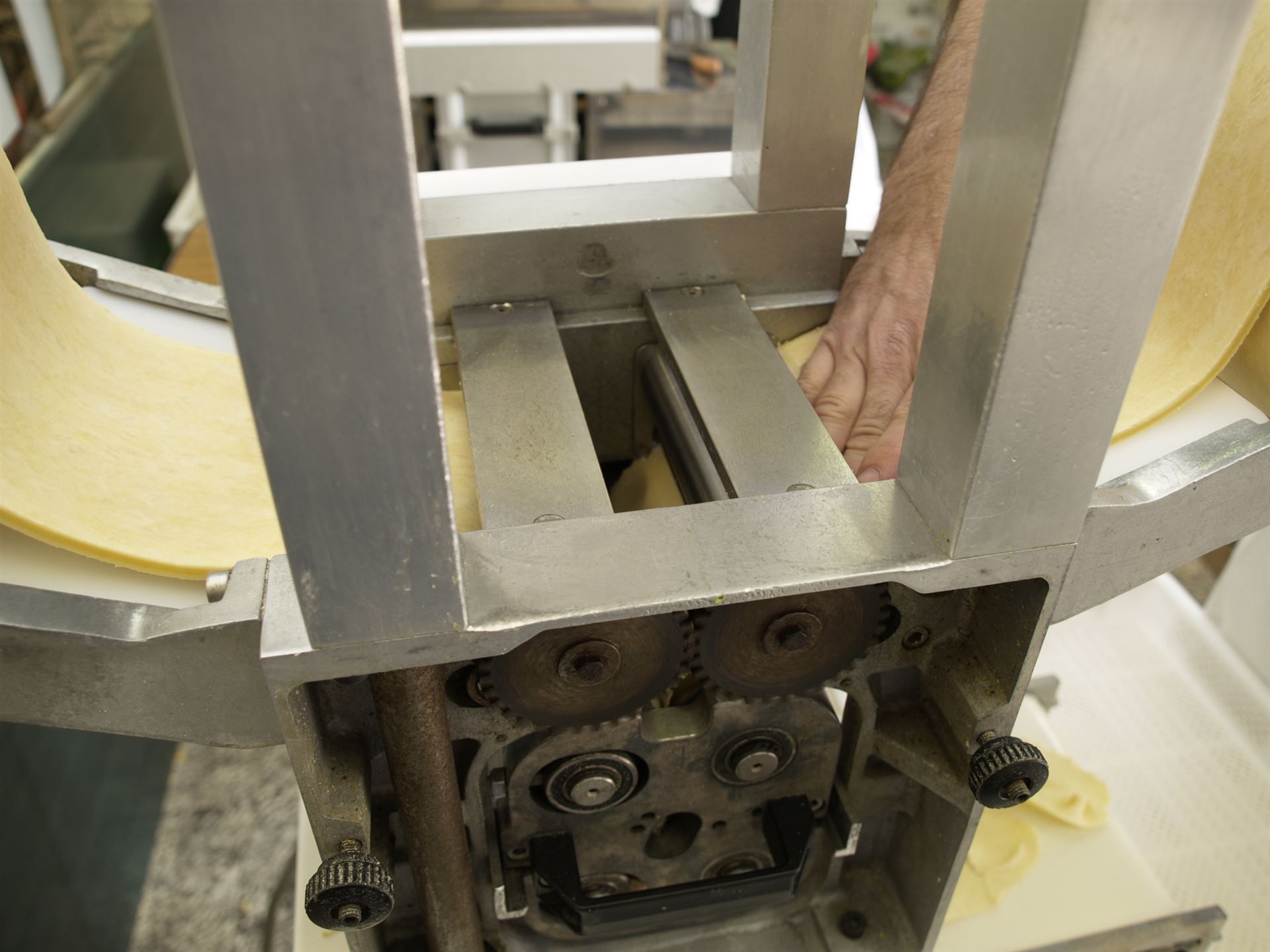 Zwei Teigrollen werden in die Ravioli-Maschine eingespannt. Eine Rolle ist für die Unterseite der Ravioli, eine für die Oberseite. Das Gefäss mit der Spinat-Füllung wird ebenfalls angebracht.