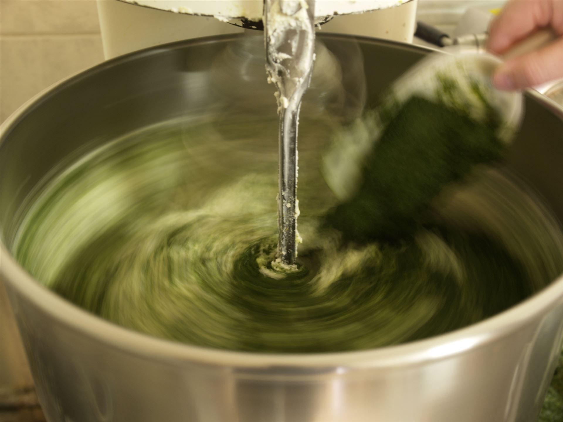 Jetzt brauchen wir noch die Füllung, welche in die Raviolis kommt. Die Schale wird mit Riccotta (Frischkäse) gefüllt. Während das Rührwerk der Maschine dreht, werden Spinat, Parmesan und Gewürze langsam beigegeben.