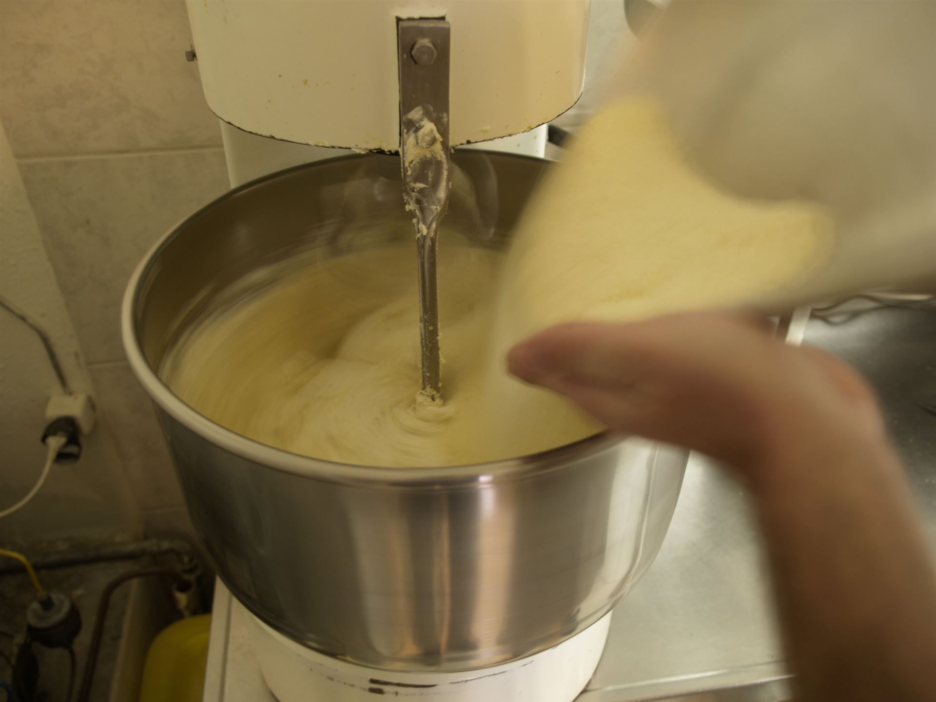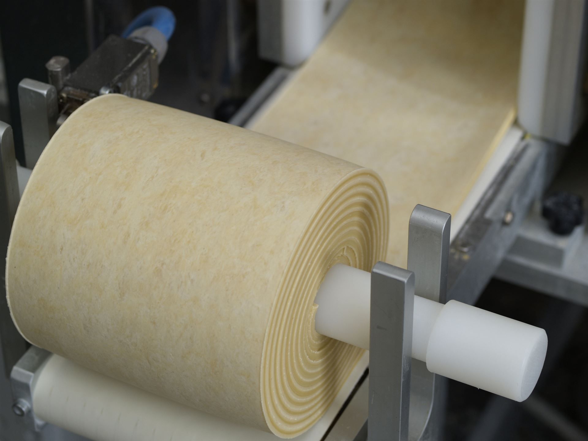 Hartweizen-Griess, Wasser, Eier und Salz brauchts dazu. All diese Zutaten kommen in die Teigmaschine und unten kommt der Teig 5 mm dick heraus, wo er gleich aufgerollt wird.