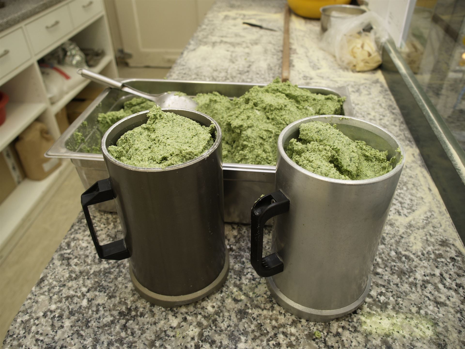 Wenn die Spinat-Füllung fein gemischt und genug gewürzt ist, wird sie in nebenstehende Gefässe gefüllt.
